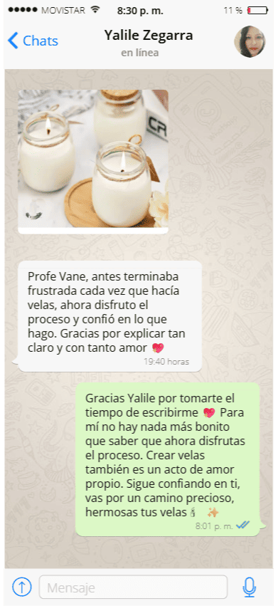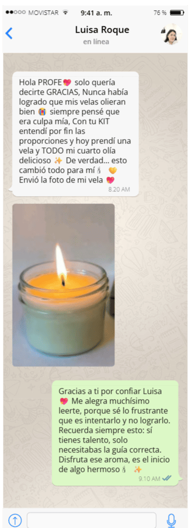 Accede a nuestra plataforma donde podrás hacer preguntas, resolver dudas y recibir apoyo para perfeccionar tus Velas. Ya sea que te trabes con una fórmula o necesites consejos para mejorar tus productos, tendrás un espacio de acompañamiento para avanzar con confianza y sin frustraciones. ¡Estar en comunidad acelera tu éxito!